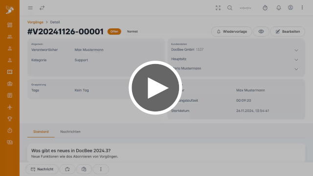 - Neu: Vorgänge können nun abonniert werden, um über Verantwortlichen-Wechsel, Status-Änderungen, neue Nachrichten, Prioritäts-Änderungen oder über Automatisierung definierte Ereignisse via E-Mail oder Benachrichtigung informiert zu werden.