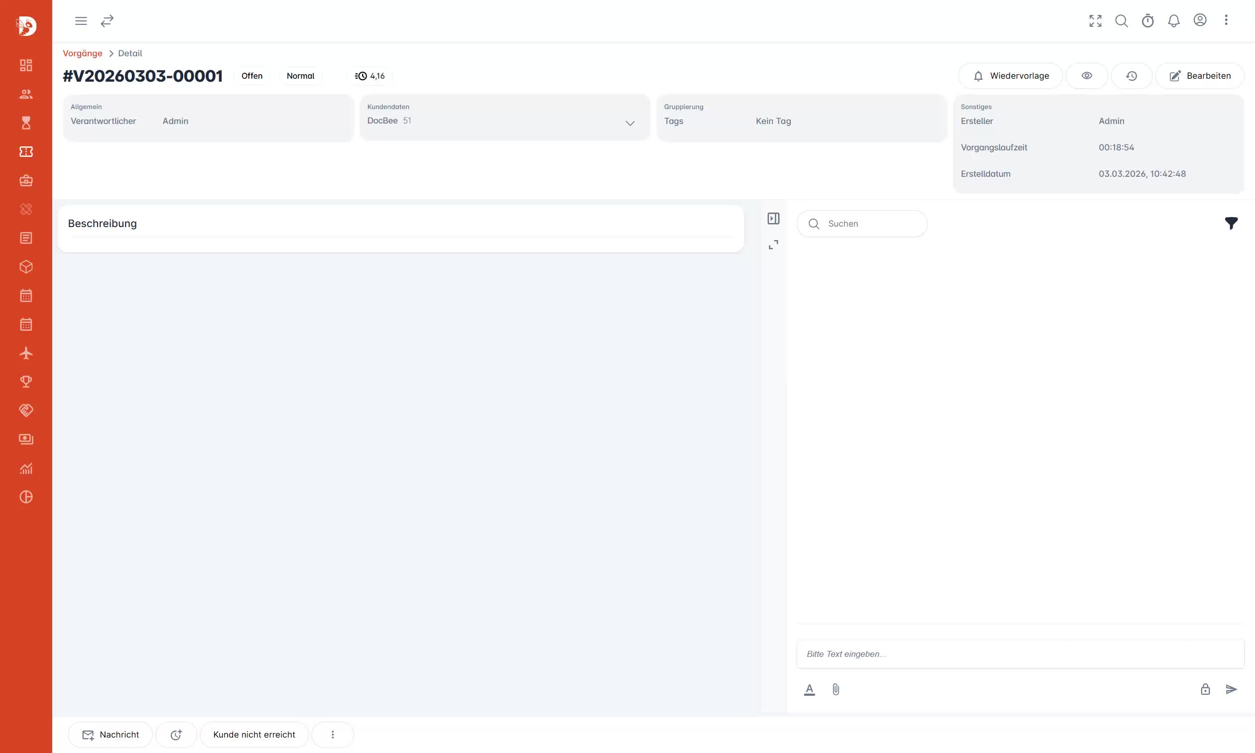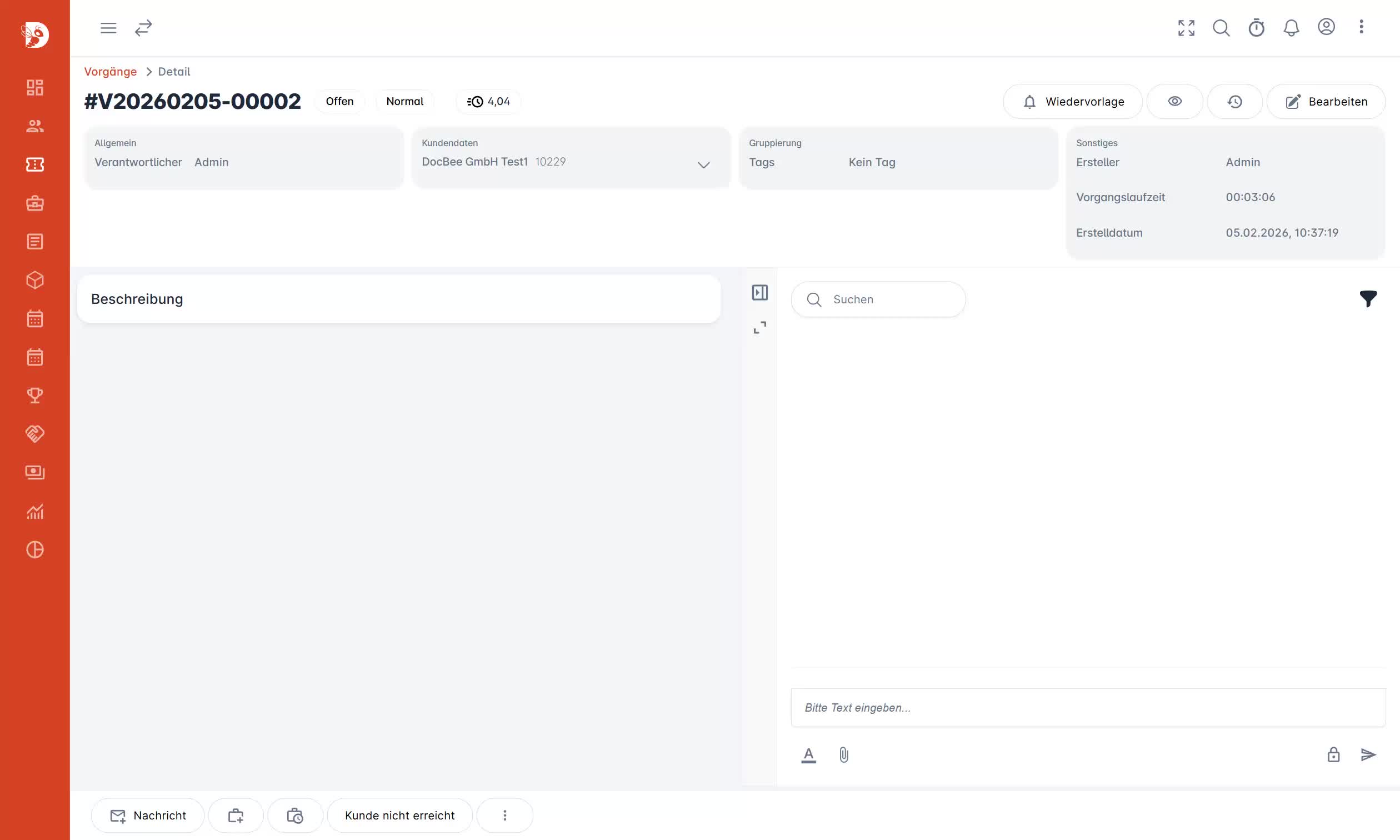Protokoll-Platzhalter werden in Protokoll-Events und bei Protokoll-Abschluss-Reaktionen unterstützt. Zum Beispiel: Eine Schaltfläche Kunde nicht erreicht, die den Status des Vorgangs ändert, eine Wiedervorlage erzeugt und eine Vorgangsnachricht erstellt. Mit einem Texteingabefeld kann der eingegebene Wert als Platzhalter in der Nachricht verwendet werden oder nach dem Protokoll-Abschluss die Vorgangs-Beschreibung automatisch mit Protokoll-Daten aktualisiert werden.